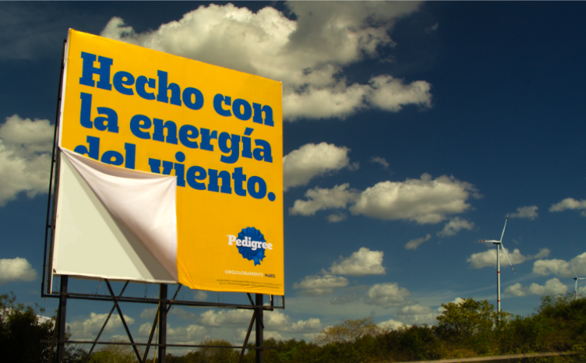 We gave the real power of wind a role in our message, with the local breeze bringing life to the billboard. The special build billboard was placed near MARS's actual wind fields in the Yucatan region, and the creative execution showed our billboard skin blown off its frame drawing attention to our message: Pedigree is "Made with the energy of the wind."